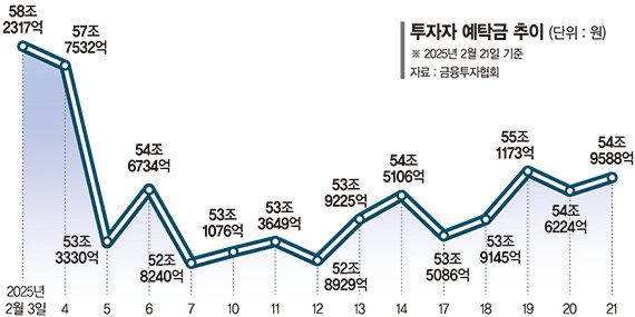 25일 금융투자협회에 따르면 지난 21일 기준 국내 주식시장의 고객예탁금은 54조9588억원으로 집계됐다. 지난 7일 52조8240억원에서 20여일 만에 2조1000억원가량 불어난 금액이다. 올해 연중 저점을 기록했던 지난달 17일 51조2701억원과 비교하면 증가폭은 3조6000억원에 달한다. 고객예탁금이 늘면서 신용공여 잔고도 치솟고 있다. 지난 12일 이후 코스피·코스닥 합산 기준 신용잔고 규모는 17조원대로 올라선 상황이다. 신용잔고는 지난 3일 16조7607억원에서 12일 17조1288억원으로 17조원대를 회복한 후 이날 현재 17조8110억원을 나타냈다. 지난달 2일 15조6823억원에 비해선 두 달여 만에 2조원 넘게 증가한 규모다.