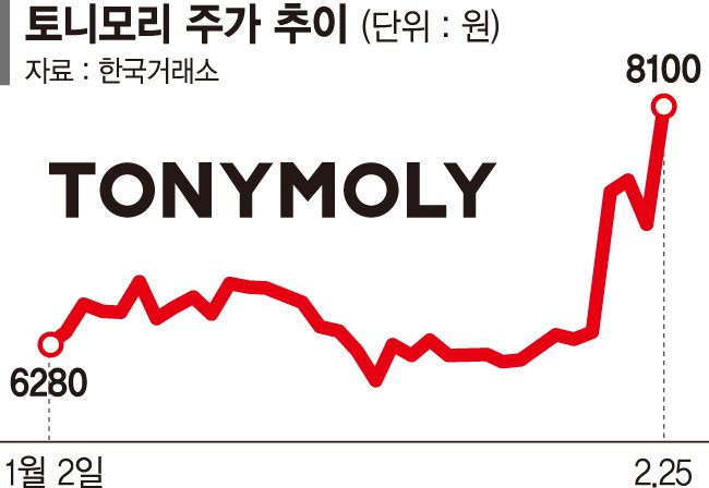 25일 한국거래소에 따르면 한한령 해제 가능성이 제기된 19일이후(18일 종가 대비 25일 종가 기준) 토니모리는 28%, 아모레퍼시픽은 4%, LG생활건강은 3% 오르며 상승세를 보였다. 이날에도 토니모리 주가는 12% 치솟았다. 개인투자자들의 매수세도 이어졌다. 지난 19일부터 25일까지 개인은 토니모리 27억원어치, 아모레퍼시픽 93억원어치, LG생활건강 27억원어치를 각각 사들였다.