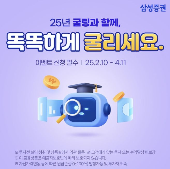 한편, 삼성증권은 로보굴링, 연금굴링 투자 고객을 대상으로 하는 이벤트를 4월 11일까지 진행한다. 이번 이벤트는 로보굴링 또는 연금굴링 서비스 이용자 중 순입금 및 투자 기준을 충족한 고객에게 상품권을 지급하는 혜택을 제공한다.