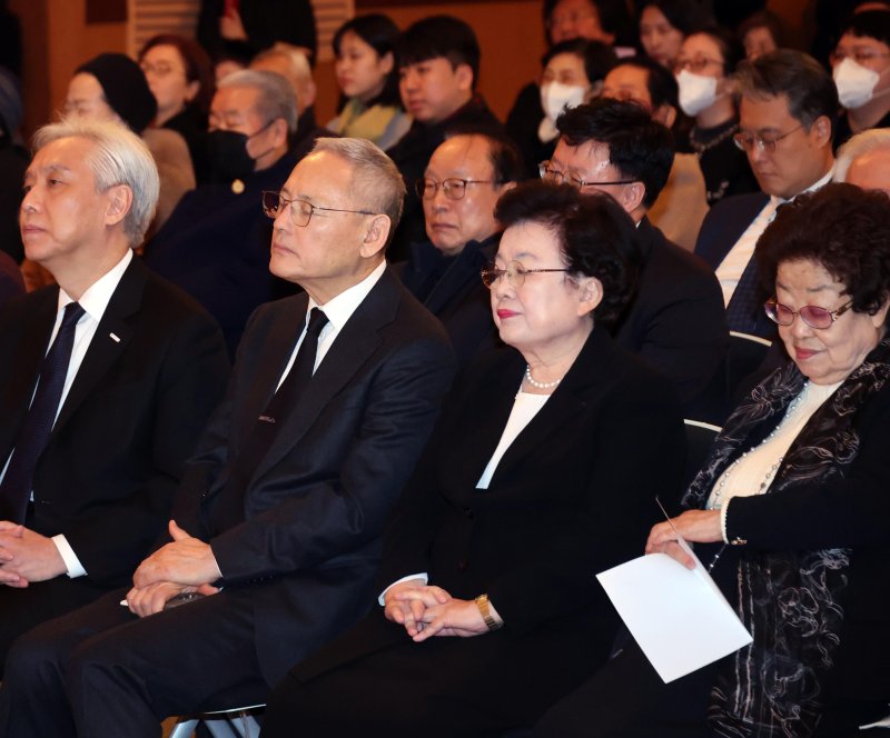 이어령 초대 문화부 장관 3주기 추모식이 26일 서울 서초구 국립중앙도서관에서 열린 가운데 유인촌 문화체육관광부 장관 및 참석자들이 박정자 배우의 이어령 시 '메멘토 모리' 낭독을 경청하고 있다. 오른쪽부터 고인의 부인인 강인숙 영인문학관장, 이배용 국가교육위원장(전 이화여대 총장), 유 장관, 김대진 한국예술종합학교 총장 사진=박범준 기자