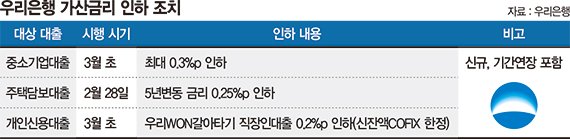 우리은행 관계자는 "순이자마진(NIM) 축소를 감수하면서 대출금리 인하를 시행하는 것은 경제성장률 하락이 가시화된 상황에서 자영업자와 취약계층의 이자 부담을 줄여야 민간 소비와 투자가 살아날 수 있다고 판단했다"고 설명했다.