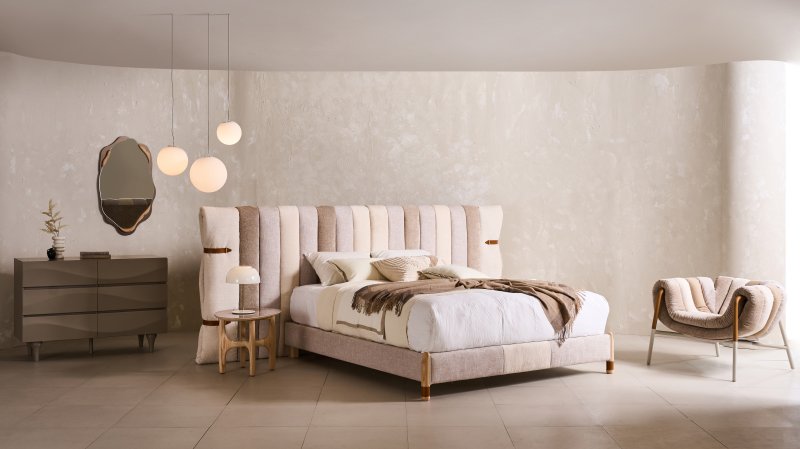 버밀리온 침대는 헤드보드에 색상과 텍스처가 각기 다른 3종의 패브릭을 레이어드로 적용해 독창적인 디자인을 구현했다. 1인 패브릭 소파는 역시 서로 다른 4종의 패브릭을 사용해 한층 더 고급스러운 분위기를 자아낸다. 체어 팔걸이에는 부드러운 가죽 소재를 더해 편안한 사용감을 높였다.