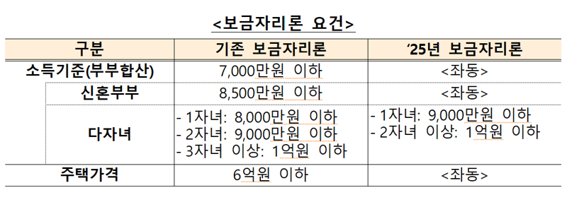 먼저 보금자리론의 소득·주택가액 등 요건은 전년 수준을 유지하되 다자녀가구 우대(부부합산 소득 최대 1억원, 대출한도 4억원, 0.5% 금리 우대) 기준을 3자녀에서 2자녀로 완화하기로 했다.