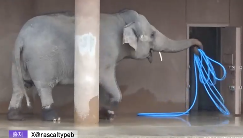 일본의 나고야 히가시야마 동식물원에서 한 아시아코끼리가 사육사를 도와 코로 호스를 둥글게 말아가며 뒷정리를 하고 있다./사진=MBC 뉴스투데이 캡처