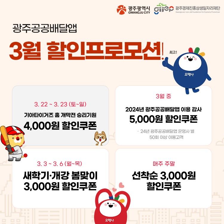 2일 광주시에 따르면 매주 토·일요일 3000원 할인 쿠폰을 제공하던 광주공공배달앱 할인 행사를 3월 한 달간 봄맞이 최대 5000원까지 제공하는 등 특별 할인 프로모션으로 진행한다.