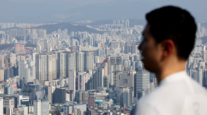 서울 남산을 찾은 관광객이 아파트 단지를 바라보고 있다. 사진=뉴스1