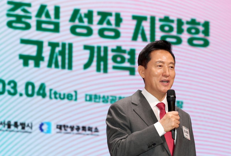 서울시는 4일 서울 중구 서울시청 대회의실에서 시민·전문가 150여명이 참석한 가운데 '규제철폐 창의 발표회'를 진행했다. 오세훈 서울시장이 이날 오전 서울 중구 대한상공회의소에서 열린 '기업 중심 성장 지향형 규제 개혁' 포럼에서 'KOrea Growth Again(다시 성장하는 대한민국)'을 주제로 기조연설을 하고 있다. 뉴시스