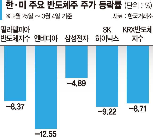 국내 반도체주 주가가 관세 및 수출 우려에 발목 잡혀 힘을 쓰지 못하고 있다. 미국발 관세 정책 현실화 우려에 엔비디아가 급락한 데 이어 국내 반도체 수출액 증가세도 꺾인 영향이다.