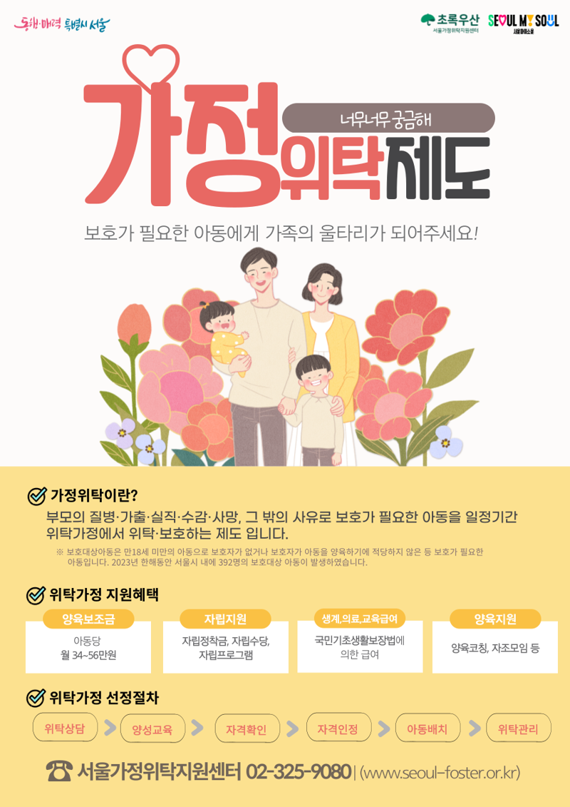 서울시는 보호대상아동의 가정형 보호를 더욱 활성화하기 위해 가정위탁지원센터를 통해 예비 위탁가정을 상시 모집·육성하고 있다.