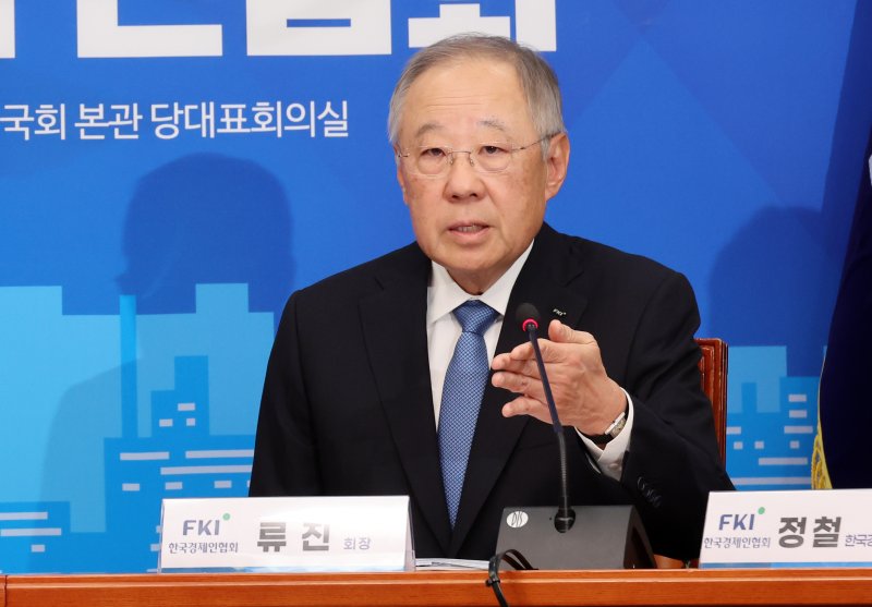 류진 한국경제인협회 회장이 5일 오후 서울 여의도 국회에서 열린 경제 활성화를 위한 더불어민주당-한국경제인협회 민생경제간담회에서 발언하고 있다. 뉴시스