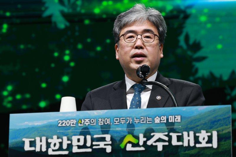 임상섭 산림청장이 5일 서울 중구 장충체육관에서 열린 대한민국 산주대회에 참석해 환영사를 하고 있다. 연합뉴스