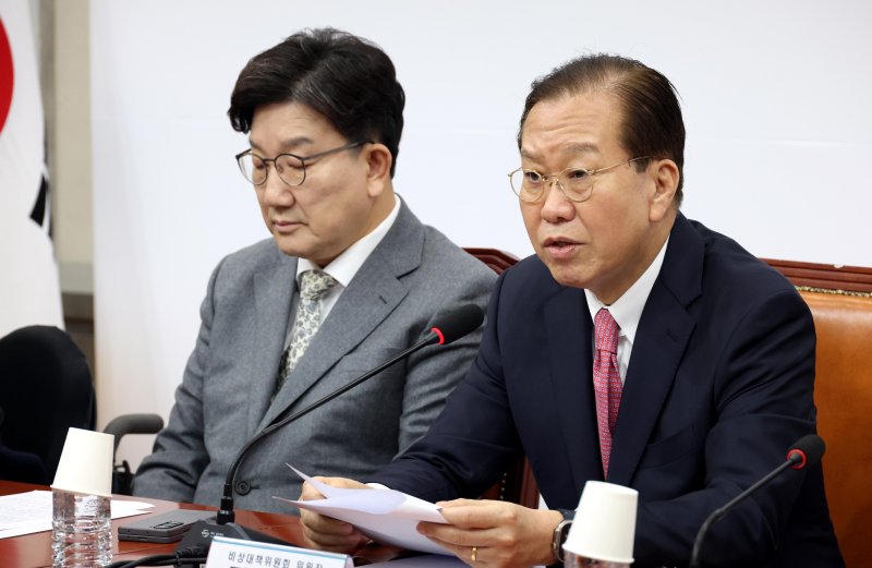 권영세 국민의힘 비상대책위원장이 6일 오전 서울 여의도 국회에서 열린 비상대책위원회의에서 발언을 하고 있다. 왼쪽은 권성동 원내대표. 뉴시스