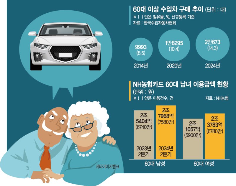 한국수입자동차협회에 따르면 지난해 60대 이상의 수입차 신규등록은 2만673대로 집계됐는데, 점유율은 14.33%까지 올랐다. 10년 전인 2014년 점유율은 8.5%로 한자릿수에 불과했지만 증가세를 지속하고 있다. 높아진 물가와 할부금리로 인해 젊은 세대는 보유하고 있던 차량도 팔아버리는 상황이지만, 액티브 시니어들은 새로운 차량 구매를 망설이지 않는 것이다.