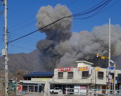 6일 경기 포천시에서 한미 연합훈련 도중 전투기의 폭탄이 민가에 떨어지는 오폭 사고가 발생, 검은 연기가 피어오르고 있다. 독자 제공·뉴스1