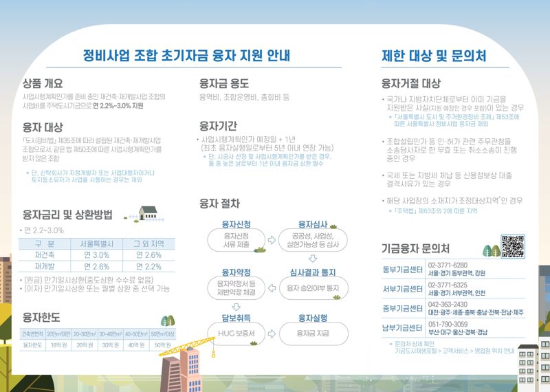 이자율은 지역별 시장상황, 사업성 등을 고려해 사업장 소재지와 사업유형에 따라 차등 적용하며, 이자는 만기에 일시 지급해도 된다. 사업시행계획인가를 받은 후 1년 이내 일시상환(최대 5년)하면 된다.