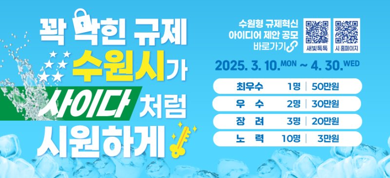 【파이낸셜뉴스 수원=장충식 기자】 경기도 수원시는 오는 4월 30일까지 '수원형 규제혁신 아이디어 제안 공모전'을 진행한다고 10일 밝혔다.