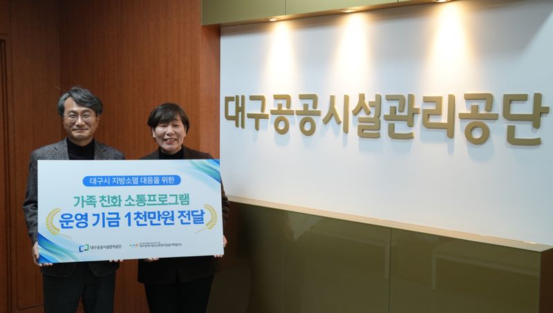 【파이낸셜뉴스 대구=김장욱 기자】 대구공공시설관리공단(이하 공단)은 대구시 지방소멸 위기 대응과 지역사회 발전을 위해 대구청소년문화의집 꼼지락발전소에 가족 소통 프로그램 운영 기금 1000만원을 기탁했다고 10일 밝혔다.