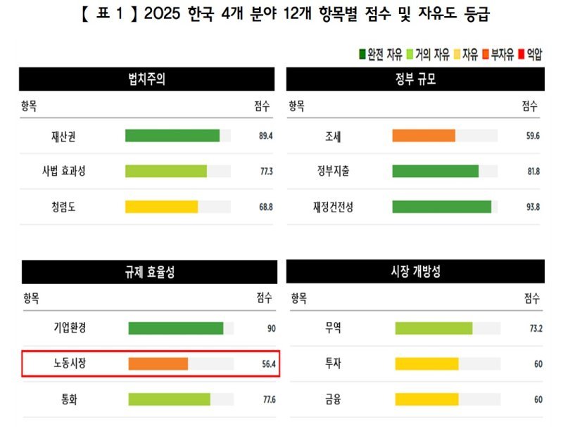 한국 노동시장의 자유 수준이 100위에 불과하다는 조사가 나왔다. 한국경영자총협회가 미국 헤리티지재단의 '2025 경제자유지수 보고서'를 인용한 자료에 나온 결과다. 184개국을 대상으로 조사한 12개 평가항목 가운데 노동시장의 경제 자유 수준이 전년도 87위에서 13단계나 떨어져 100위를 기록한 것이다.