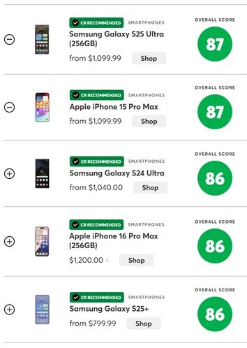 공동 2위는 82점을 획득한 갤럭시 S25 플러스, 갤럭시 S24 울트라, 아이폰 16 프로 맥스였다.