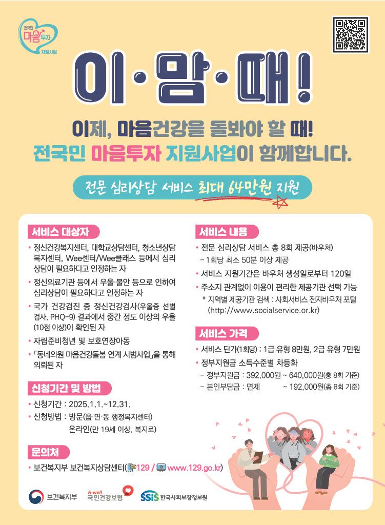 지원 대상은 △정신건강복지센터, 대학교 상담센터, 청소년상담복지센터, Wee센터 및 Wee 클래스, 정신의료기관 등에서 심리 상담이 필요하다고 인정받은 시민 △자립준비청년 및 보호연장아동 △국가건강검진에서 중간 정도 이상의 우울이 확인된 시민이다.