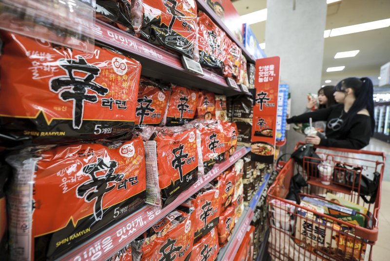 지난 5일 서울 시내 대형마트에 농심 신라면이 진열돼 있다. 농심은 오는 17일부터 신라면과 새우깡의 가격을 조정하고, 총 56개 라면과 스낵 17개 브랜드의 출고가를 평균 7.2% 인상한다고 밝혔다. 뉴시스 제공