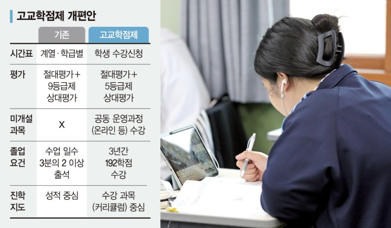 '고교학점제'는 학생이 진로·적성에 따라 과목을 선택하고, 이수 기준에 도달한 과목에 대해 학점을 취득·누적하면 졸업하는 제도다. 학생들이 각각 수강신청을 해 졸업 요건을 채우는 대학교와 유사한 형태다.