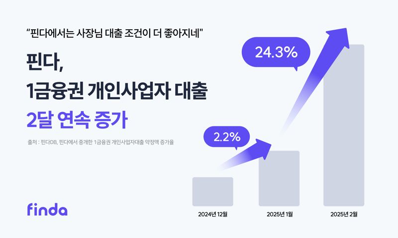 핀다에 따르면 개인사업자 대출 중개 금액이 지난 1월에는 전월 대비 2.2% 증가했으며 지난 2월에는 전월 대비 24.3%, 전년 대비 29% 각각 증가하며 2개월 연속으로 증가세를 보였다.