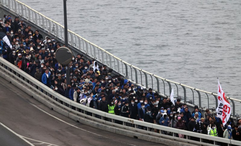더불어민주당 국회의원들과 당직자·당원들이 12일 오후 서울 마포구 마포대교에서 광화문 방향으로 윤석열 대통령 퇴진을 촉구하는 행진을 하고 있다. 뉴시스