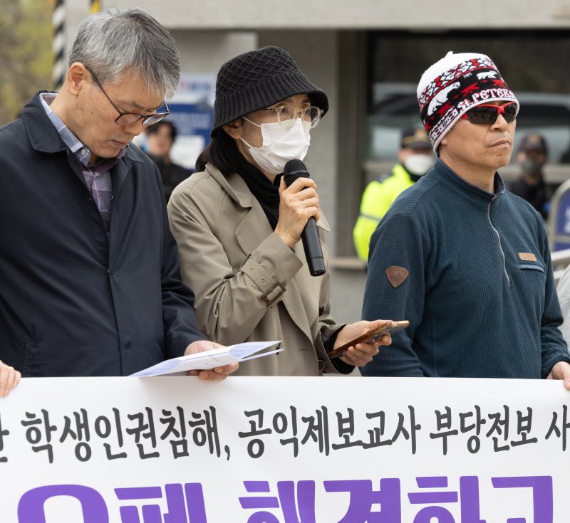 지혜복 교사(왼쪽 두번째)가 서울 종로구 서울시교육청 앞에서 열린 공익제보교사 부당전보 사안 관련자 고발 기자회견에서 발언하고 있다. 뉴스1