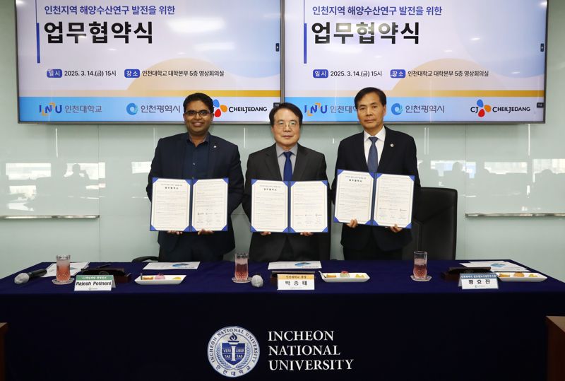 라제시 포티네니 CJ제일제당 경영리더(왼쪽)와 박종태 인천대학교 총장, 황효진 인천시 글로벌도시정무부시장이 14일 ‘인천지역 해양수산연구 발전' 업무협약을 맺고 기념촬영을 하고 있다. 인천대 제공.