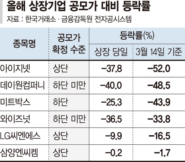 데이터와 인공지능(AI) 기술 기반 '인슈어테크'를 표방한 아이지넷은 상장일 공모가 대비 37.8% 하락 마감한 데 이어 지난 14일까지 50%가 넘는 하락세를 보이고 있다. 또 축산물 전자상거래 플랫폼 기업 미트박스와 올해 장외 최대어로 증거금만 20조원 넘게 몰렸던 LG씨엔에스는 공모가 대비 각각 43.9%, 16.5% 하락한 주가에 거래 중이다.