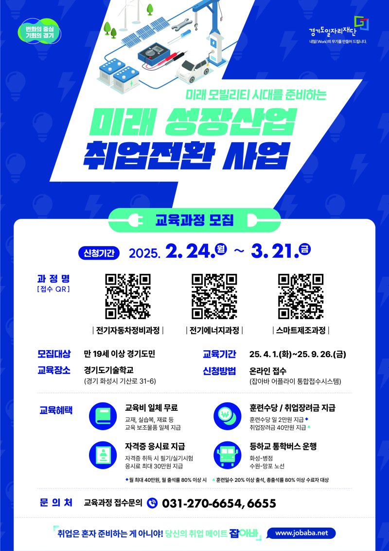이진희 경기도일자리재단 융합인재본부장은 "전기차, 전기에너지, 스마트제조 등 미래 산업에서 요구하는 기술을 익히고, 취업까지 연계될 수 있도록 적극 지원할 계획"이라며 "많은 청년과 구직자들이 이번 교육을 통해 성장할 기회를 잡길 바란다"고 말했다.