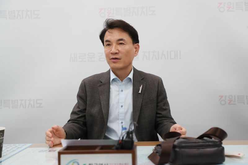 김진태 강원특별자치도지사가 17일 도청 기자실에서 간담회를 갖고 기후테크 산업을 육성에 대한 계획을 설명했다. 강원특별자치도 제공