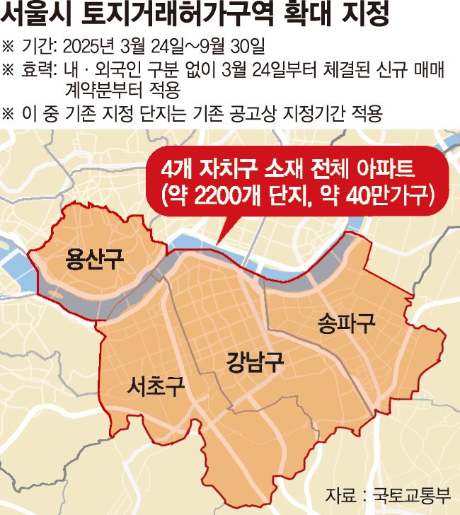서울 강남3구(강남·서초·송파) 아파트가 한 달 만에 토지거래허가구역(토허제)으로 재지정됐다. 또 집값 상승세가 가파른 용산구 아파트는 토지거래허가구역으로 신규 지정됐다. 이에 따라 서울시 면적의 3분의 1, 40만가구가량이 토허제로 묶이게 됐다.