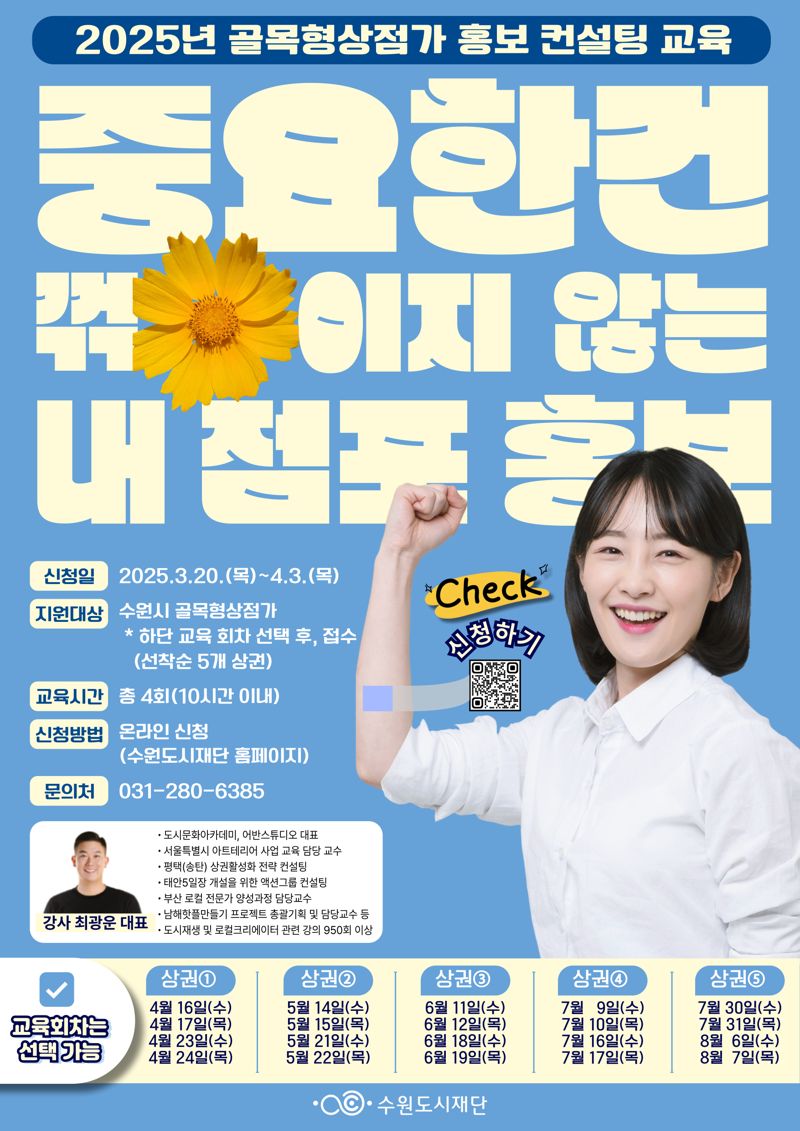 【파이낸셜뉴스 수원=장충식 기자】 수원도시재단은 골목형상점가의 경쟁력 강화를 위한 '2025년 골목형상점가 홍보 컨설팅 교육'에 참여할 상권을 모집한다고 20일 밝혔다.