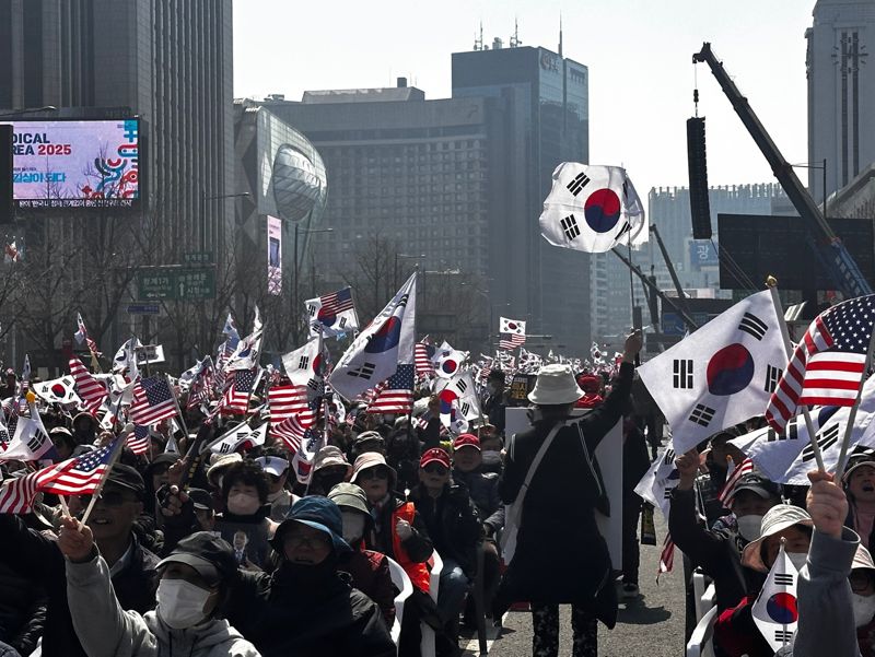 22일 경찰에 따르면 자유통일당 등 윤 대통령 탄핵 반대 집회를 주최하는 '대한민국바로세우기 운동본부' 측은 이날 오전 12시께부터 서울 광화문역 인근에서 '광화문 혁명 국민 대회' 집회를 이어가고 있다. 주최 측은 경찰에 집회 신고 인원을 20만명으로 신고했다. 경찰 측 비공식 추산인원은 2만명이다. 집회 측은 광화문역 6번 출구 동화면세점 인근부터 시청역 덕수궁까지 570여m 도로 위에서 집회를 진행 중이다.