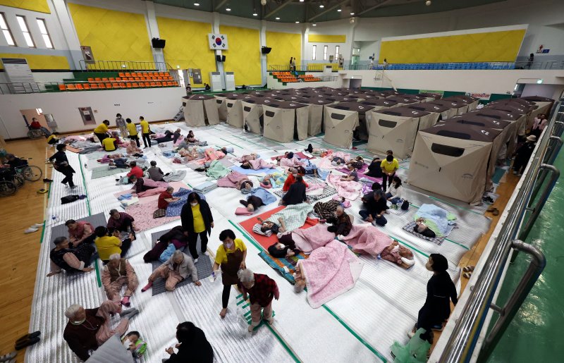 경북 의성군 산불 발생 이틀째인 23일 의성실내체육관에 마련된 임시 대피소에 이재민들이 휴식을 취하고 있다. 뉴시스