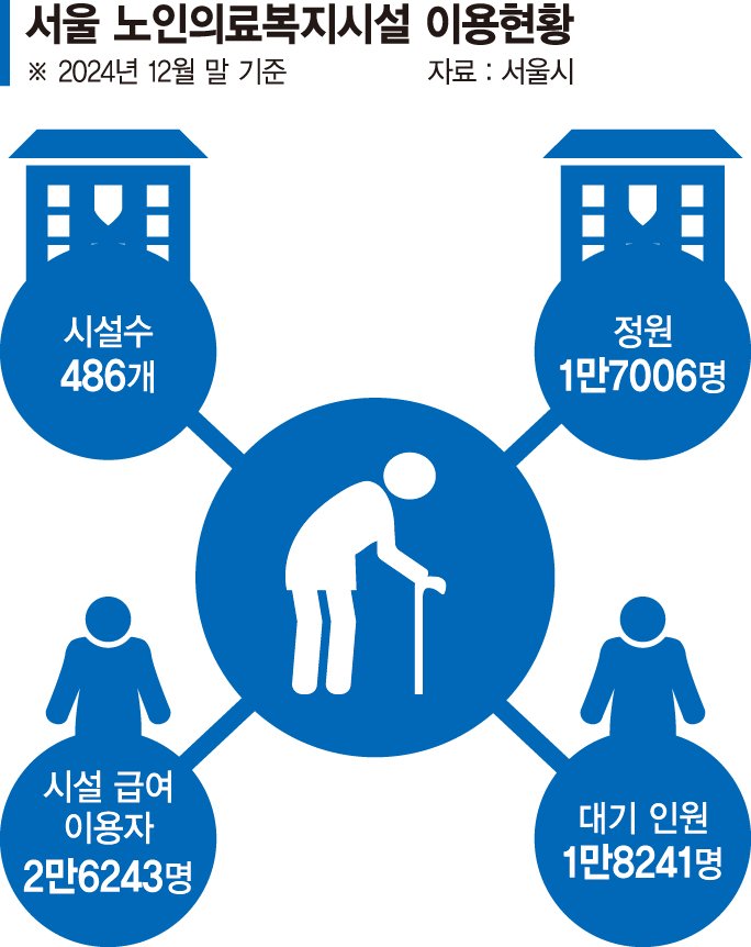현재 서울은 노인요양시설이 부족한 상태다. 서울시 노인의료복지시설 현황을 살펴보면 지난해 12월 말 기준으로 시에 위치한 486개 노인의료복지시설의 정원은 1만7006명이지만 2만6243명이 이용하고 있다. 노인요양시설에 입소하지 못하고 있는 대기인원은 1만8241명에 달한다. 1명의 노인이 다수의 시설에 입소 신청을 할 수 있어서 중복 집계 가능성이 있지만 대기자가 정원보다 많은 셈이다.