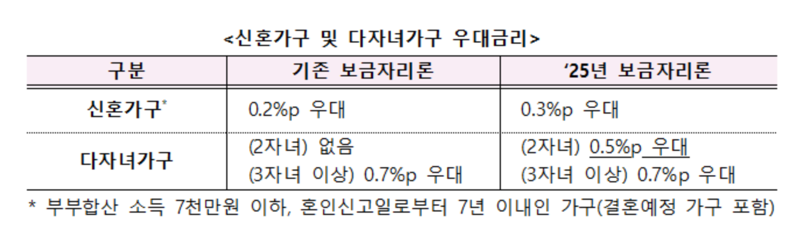 저출생 문제 대응을 위해 신혼가구 우대금리 폭을 확대(0.2→0.3%포인트)하고, 2자녀 가구를 위한 우대금리(0.5%p)도 신설됐다. 1·2자녀 가구에 대한 보금자리론 소득요건을 1000만원씩 완화해 주택구입 실수요자의 대출신청 문턱을 낮췄다.