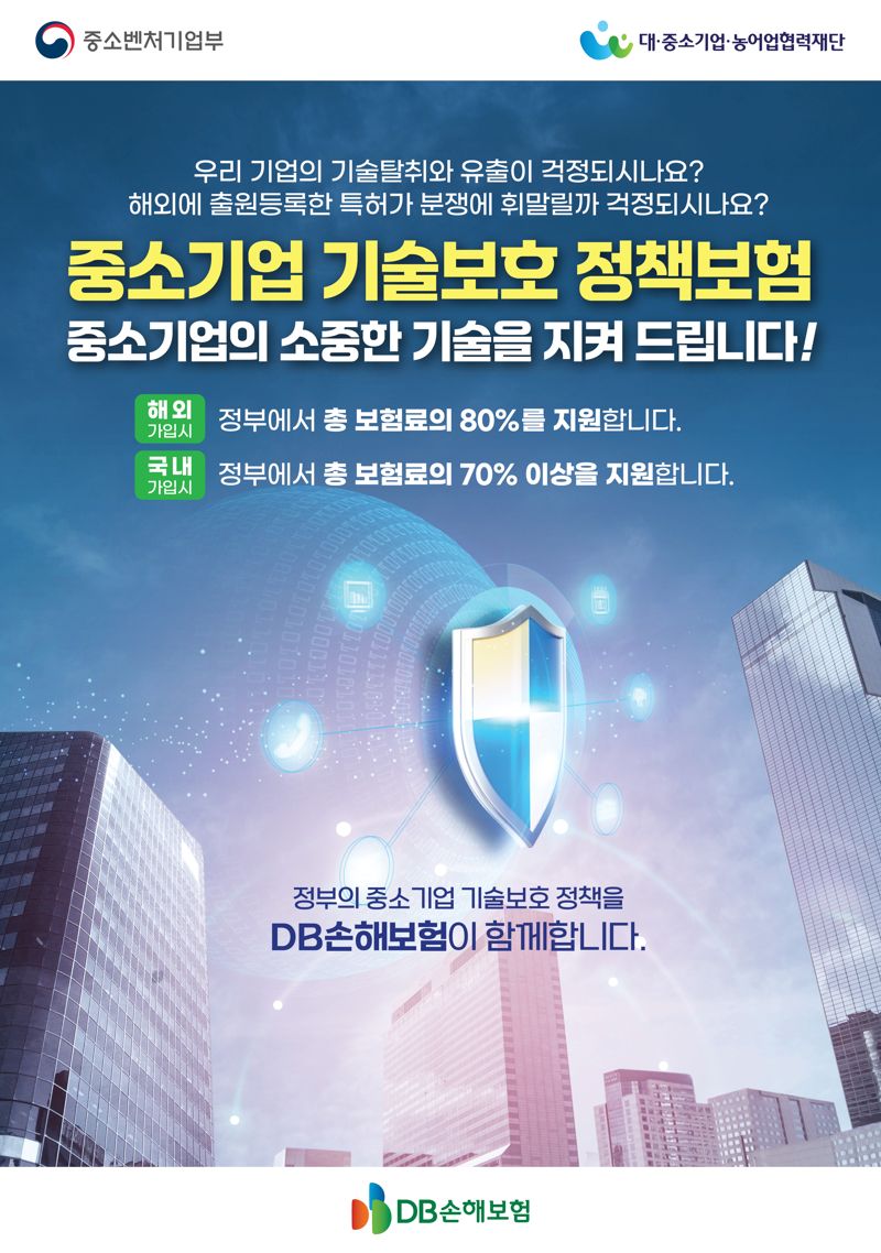 [파이낸셜뉴스] DB손해보험이 중소벤처기업부와 함께 중소기업의 기술분쟁 시 발생하는 법률분쟁비용을 보험을 통해 보상받는 ‘중소기업 기술보호 정책보험(이하 정책보험)’을 도입하고, 지난 3월 4일부터 해당 상품에 대한 가입지원을 하고 있다고 25일 밝혔다.