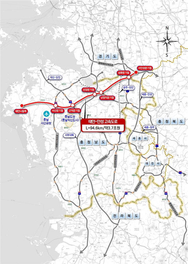 태안~안성 고속도로는 태안읍에서 서산, 예산, 당진, 아산, 천안 등 도내 5개 시·군을 거쳐 경기도 안성까지 94.6㎞를 연결하는 사업으로, 총 사업비는 3조 7000억 원에 달한다.