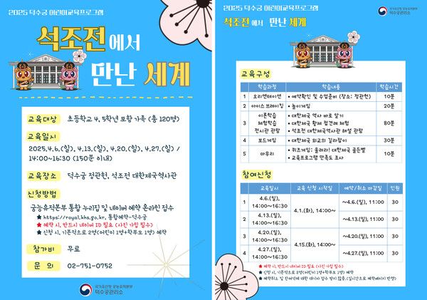 참여 대상은 초등학교 4~5학년 어린이며, 어린이 1명당 보호자 1명 동반을 필수로 회차별 30명씩 총 120명을 신청받는다. 참가비는 무료이며 덕수궁 입장료는 별도로 내야 한다.