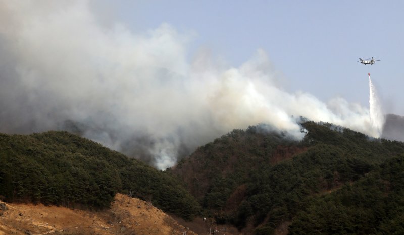 경남 산청 대형 산불 닷새째인 25일 오후 지리산과 인접한 산청군 시천면 구곡산 일대에 산불이 번져 산불진화 헬기가 진화작업을 하고 있다 /뉴스1 제공