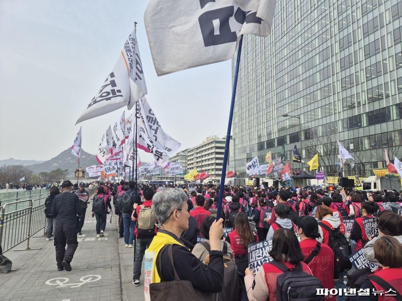 민주노총은 결의대회에 앞서 이날 오후 3시부터 인력을 3그룹으로 나눠 서울역과 명동역, 서울고용노동청에서 광화문 광장까지 시가행진을 했다. 경찰은 집회 인원을 관리하기 위해 20개 기동대, 경찰관 1200명을 투입했다.
