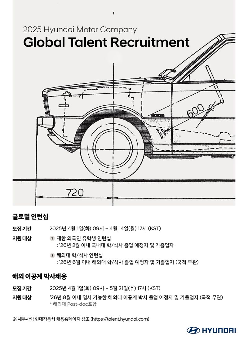 현대차 관계자는 "현대자동차는 글로벌 경쟁력 강화를 위해 잠재력과 전문성을 갖춘 인재를 적극 확보할 계획"이라고 말했다.