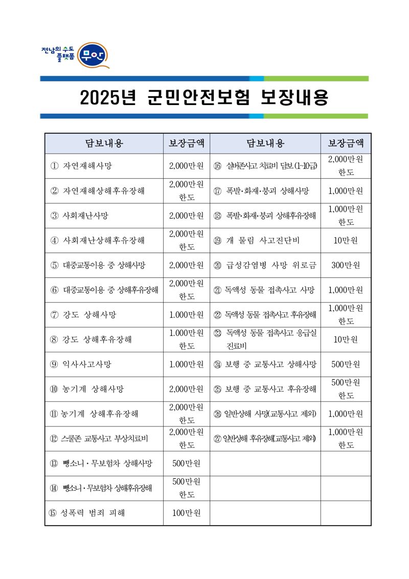 무안군에 따르면 군민안전보험의 보장 항목은 △자연재해 상해사망, 상해후유장해 △농기계사고 상해사망, 상해후유장해 △폭발·화재·붕괴 상해사망, 상해후유장해 등 총 27종목이며, 보장 항목에 따라 최대 2000만원까지 보장된다.