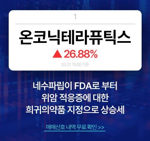 최적의 매매타이밍을 실시간으로 전송하여 투자자들에게 도움이 되고 있는 주식AI 라씨매매비서가 오늘 분석한 인기검색종목은 온코닉테라퓨틱스+26.88%, 모비데이즈 +13.79%, 콜마홀딩스 +8.01%, 흥구석유 +4.02%, 현대로템 +3.44%