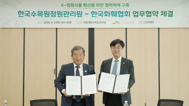 한국수목원정원관리원은 3일 국립세종수목원에서 ㈔한국화훼협회와 국산 정원식물 확산을 위한 업무협약을 맺었다고 밝혔다.