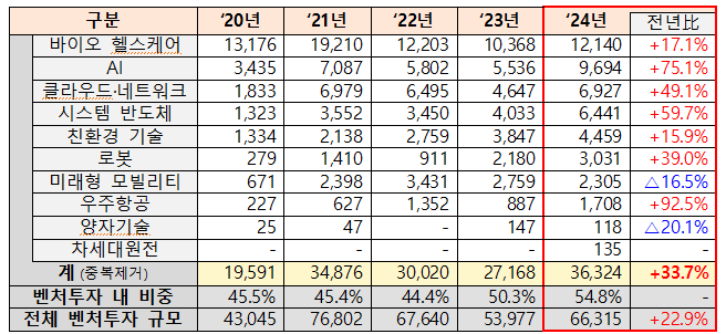 8일 중소벤처기업부는 이 같은 내용의 '2024년 딥테크 10대 분야 벤처투자 동향'을 발표했다. 중기부가 정의하는 딥테크는 △ AI·빅데이터 △ 시스템반도체 △ 로봇 △ 모빌리티 △ 클라우드·네트워크 △ 우주항공 △ 친환경기술 △ 양자기술 △ 바이오헬스케어 △ 차세대원전이다.