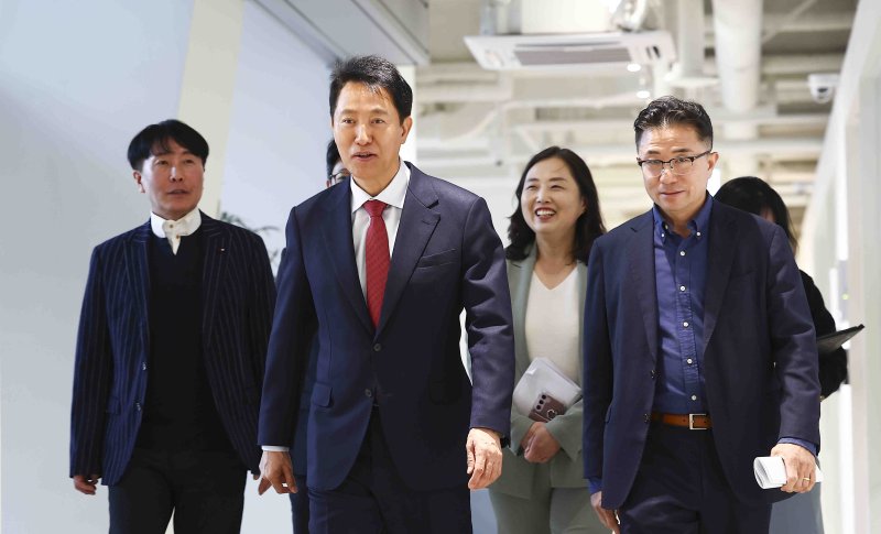 오세훈 서울시장(왼쪽 두번째)이 9일 서울 도봉구 청년취업사관학교에서 교육생들과 간담회를 하기 위해 이동하고 있다. 뉴시스